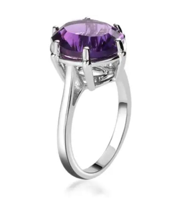 Crafted in bright and solid platinum overlay sterling silver, the cathedral shank of this solitaire ring manages to make the amethyst appear more prominent.