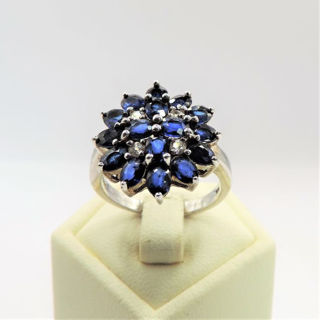 A fabulous ring in sterling silver set with 16 x Marquise Cut Blue Sapphires and 4 x round white Sapphires.