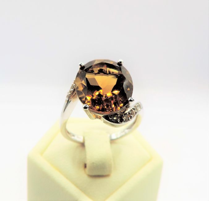 A fabulous sterling silver ring set with a 14x11mm (8ct) Palmeria Citrine with white Sapphire gemstones in the curved shoulder surround.