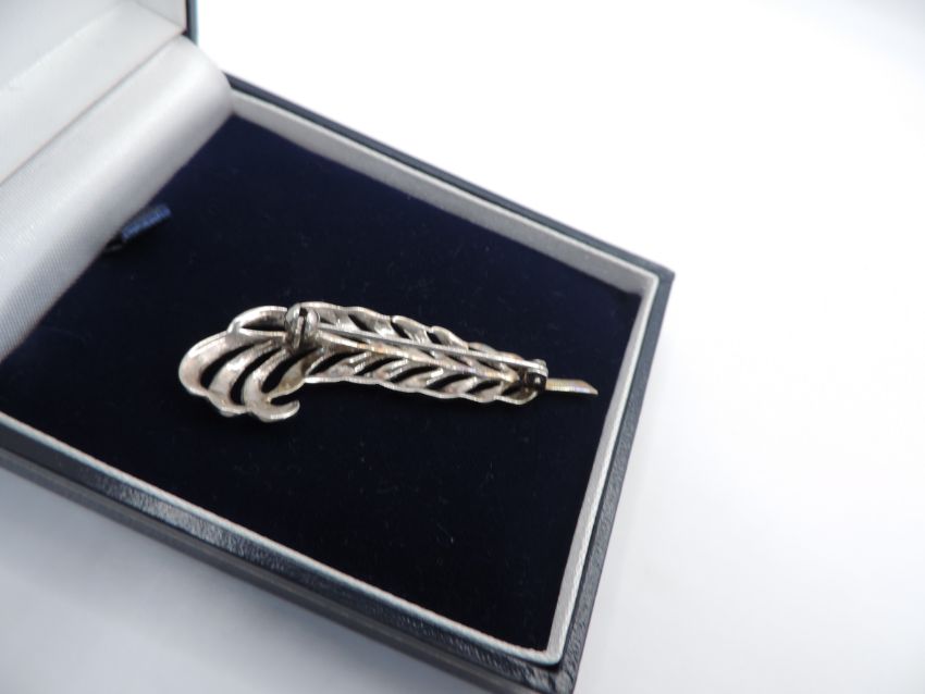 A lovely sterling silver Brooch leaf shaped set with Marcasite gemstones.