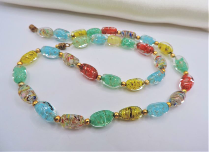 A beautiful Murano Glass bead necklace 17 inches long with a screw clasp and 31 x 10mm multi colour glass beads and 22 gold tone spacer beads.