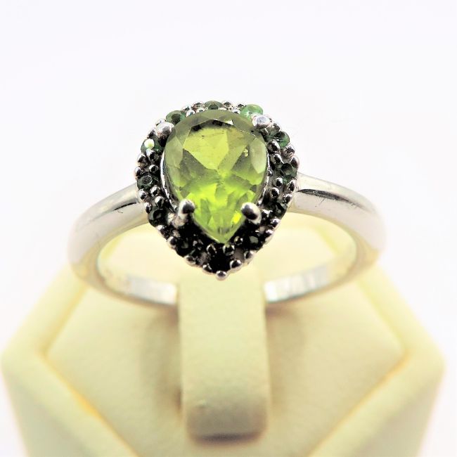 A pretty ring in sterling silver set with a 8x6mm (TCW1.5) Pear Cut Peridot with a halo of 16 x 1mm Peridot gemstones (TCW 0.32).