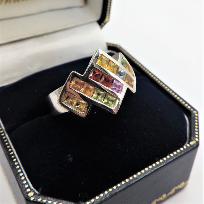 A lovely ring in sterling silver set with 15x2mm multi colour gemstones (tcw 1.05).