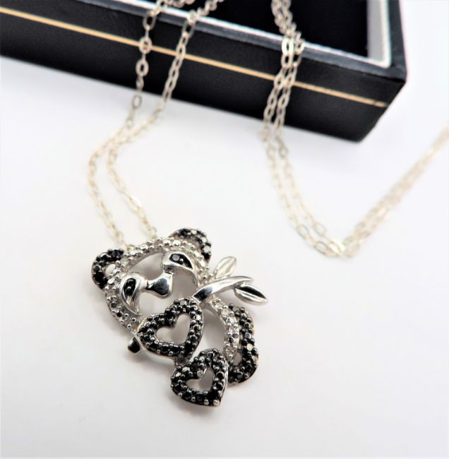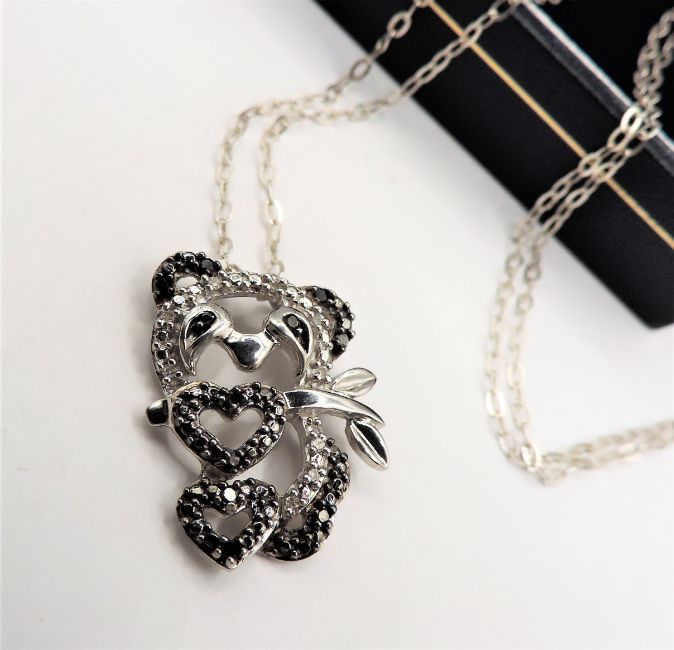 A pretty sterling silver Koala bear with hearts pendant set with black and white diamonds on a 16 inch sterling silver chain.