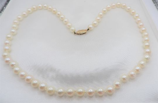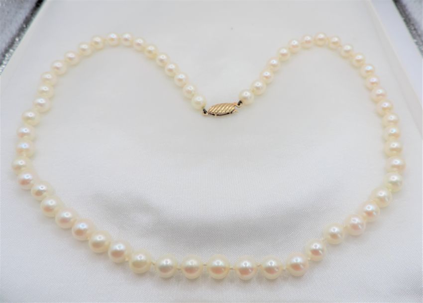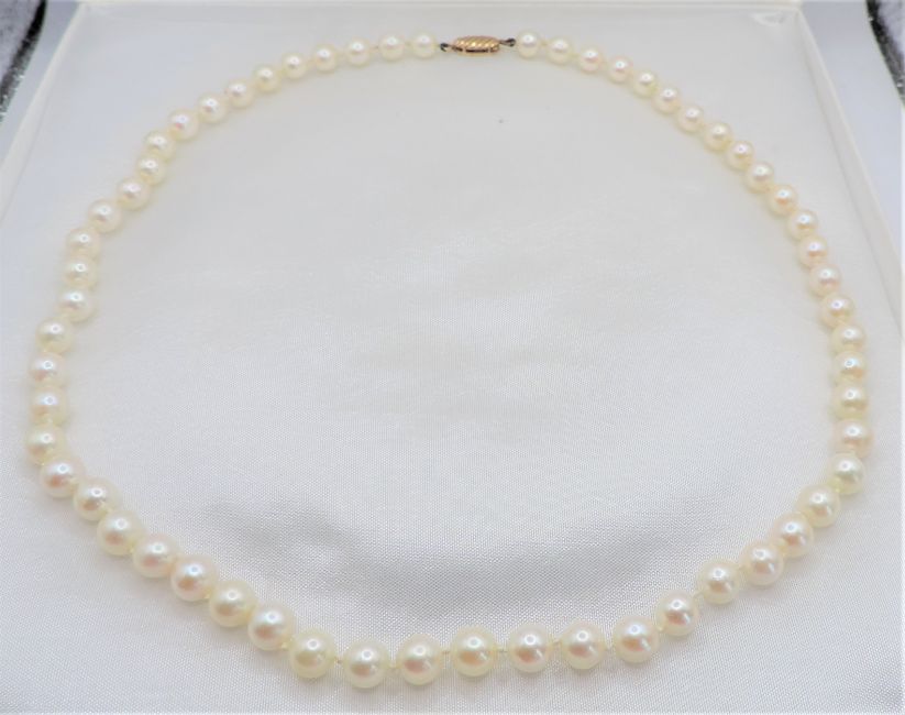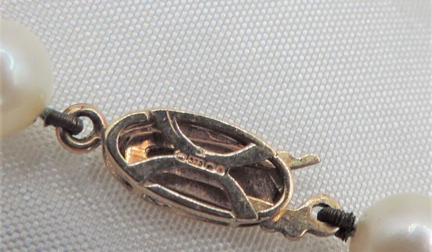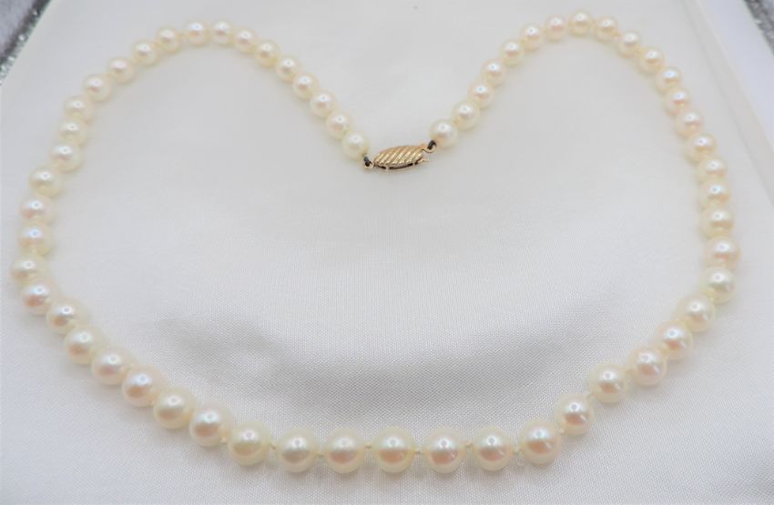 The necklace has a 9k gold clasp with 59 x 6mm rich cream high lustre pearls hand knotted between each.
