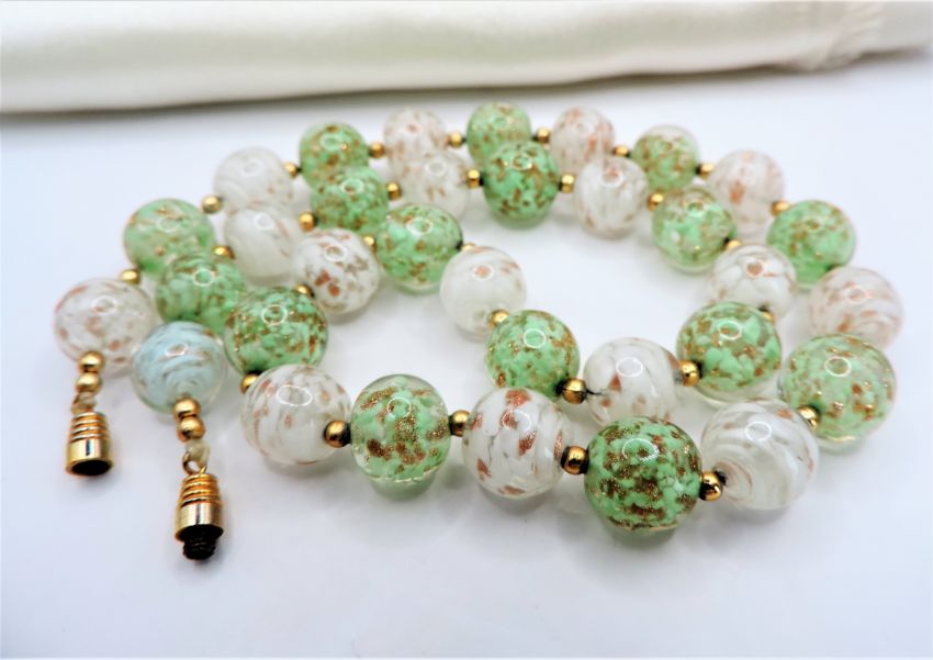 Title: Vintage Murano Glass Necklace Green & White Beads With Gold Aventurine