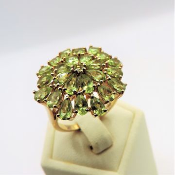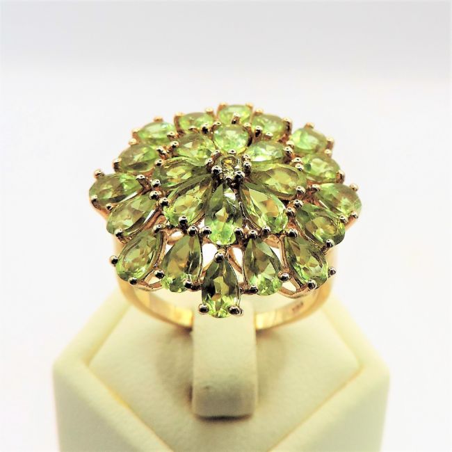 Title: 18K Gold On Silver Ring Set With 23 Pear Cut Peridot Gemstones - New With Gift Box