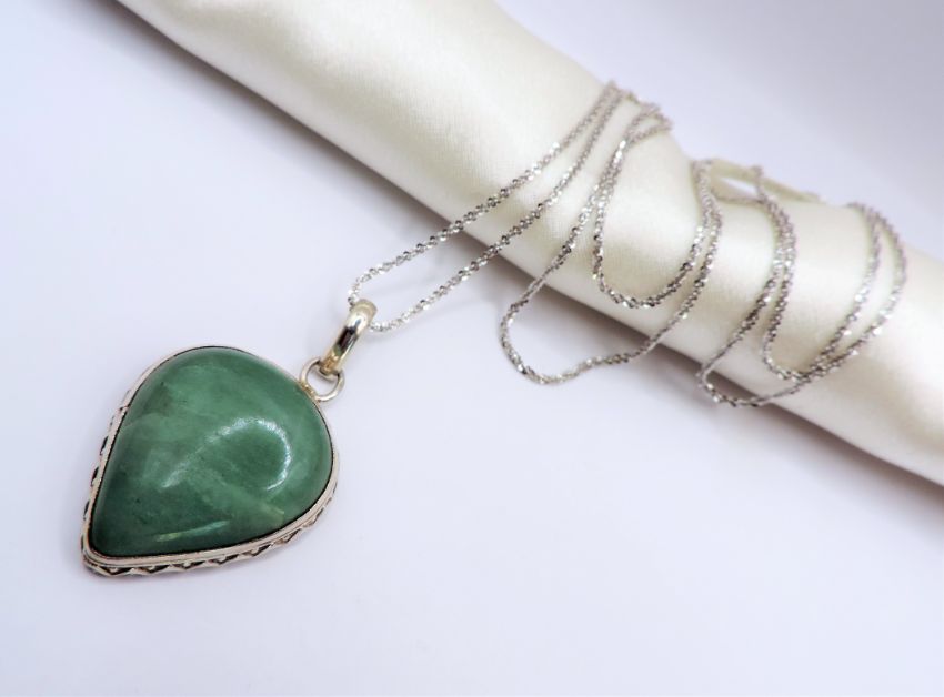 A hand made sterling silver pendant set with a 30x25mm pear shape Cryoprase gemstone on a 30 inch sterling silver Margarita Twisted Rock Chain.