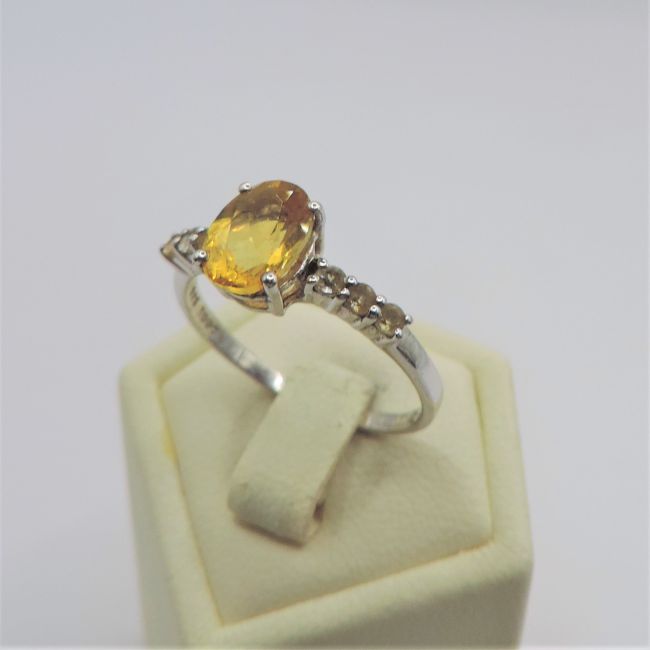 A beautiful sterling silver ring set with a 8x6mm Oval Yellow Citrine (1.5 tcw) with diamonds set in the shoulders.