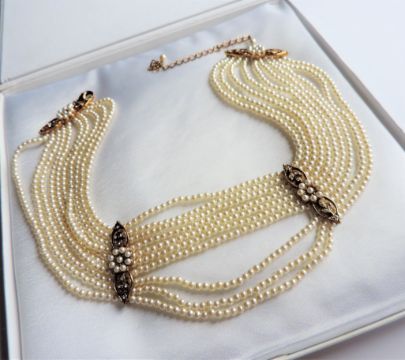 A beautiful 10 stand pearl necklace with decorative spacer bars set with crystals and pearls.