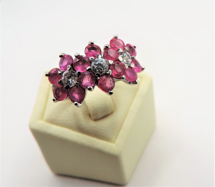 A beautiful ring in sterling silver set with 18 x 3mm (TCW 2.6) African Pink Red Ruby gemstones and 3 x 3mm white Topaz gemstones.