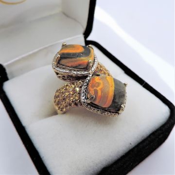 A fabulous statement ring in sterling silver set with 2 x 11x9mm Bumble Bee Jasper gemstones (TCW 8.0) and 38 x 1mm yellow citrines (TCW 0.30).