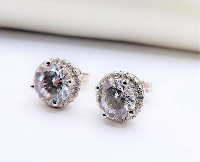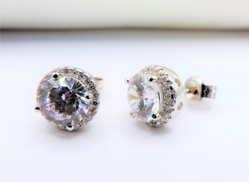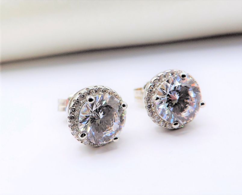 A beautiful pair of 925 sterling silver stud earrings by Tresor of Paris each set with a 8mm (TCW 7.20) sparkling Cubic Zirconia with a halo of CZ gemstones.