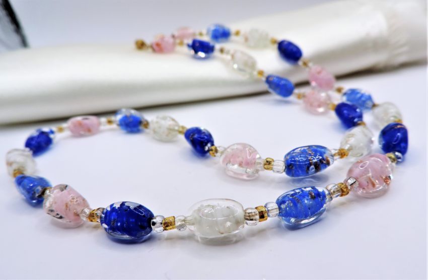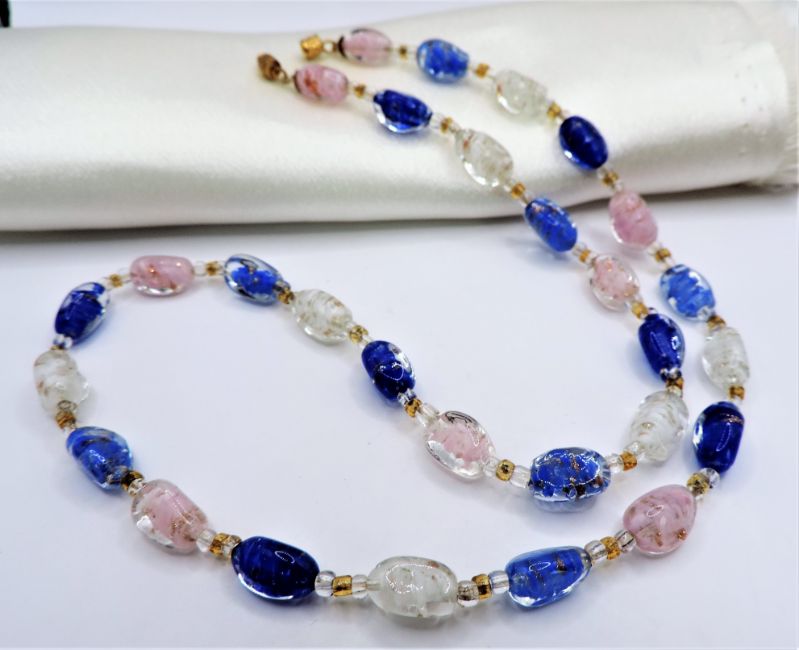 A gorgeous Murano glass necklace 21 inches long with hand blown blue and pink beads infused with gold Aventurine 12mm in size and spacer beads between each.