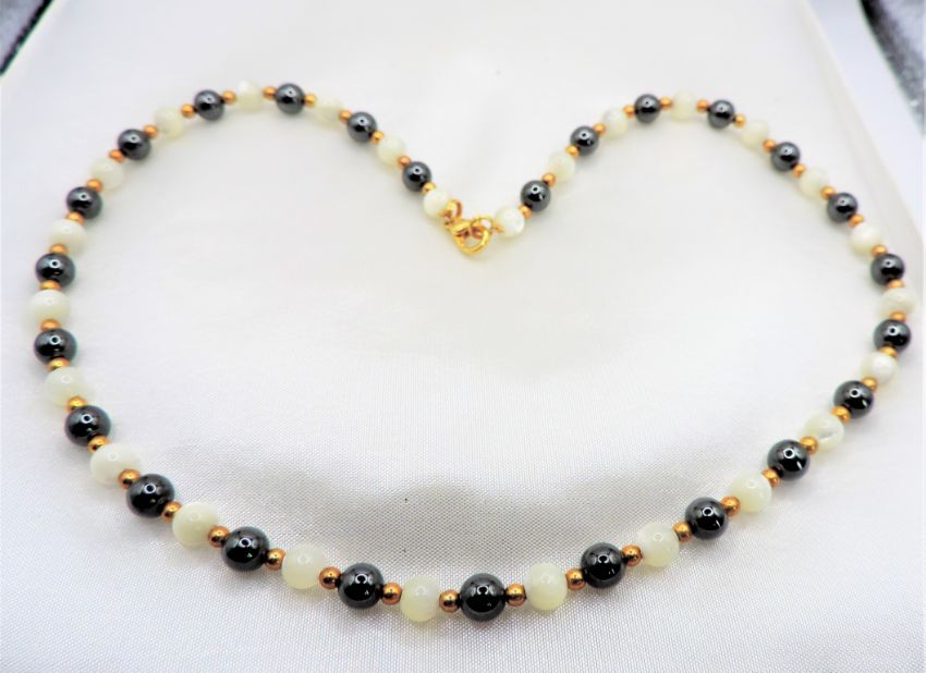 A gorgeous necklace 17 inches long strung with 51 x 5mm Hematite and White Jade beads with gold plated spacer beads and secured with a gold plated clasp.