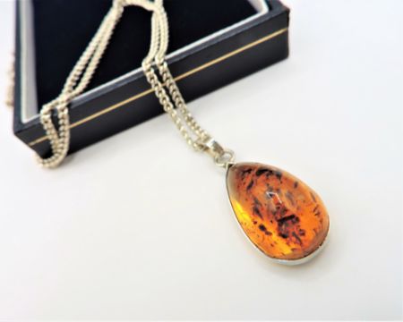 A lovely sterling silver teardrop Baltic Amber (21x13mm) on a 16 inch sterling silver chain.