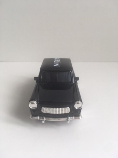 This work is a 1:39 scale model in BLACK of Noir's full-size, hand-painted Trabant car.