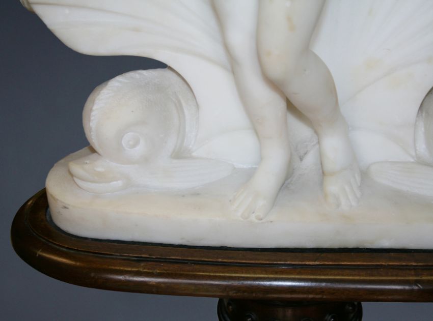 Carved white marble sculpture standing on original fluted column mahogany pedestal.