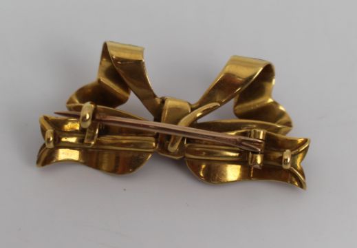 Title: 18ct Gold Enamel Pearl Bow Form Brooch