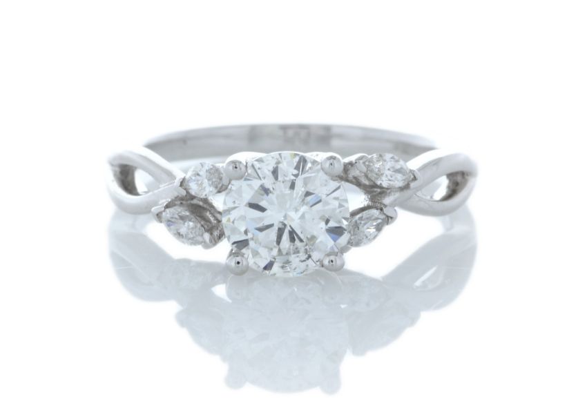 A beautiful collection colour 1.00 carat round brilliant cut diamond sits between four marquise shaped diamonds to create a leaf shape illusion on this gorgeous twist shank engagement ring with a total diamond weight of 1.16 carats.