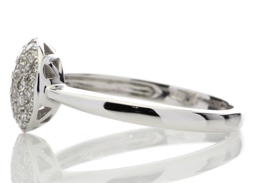 Thirty seven round brilliant cut diamonds are pave set to create an illusion of a large diamond set in a 9ct white gold ring.