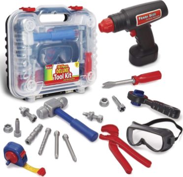 - 19 PIECE TOY TOOL SET (+Case) Our toy tool set for children includes everything he or she needs to channel his or her inner mechanic, contractor or handyman. Includes safety goggles, a real tape measure, a play hammer, nails, nuts, bolts, a ratchet, channel lock pliers and a screwdriver.