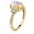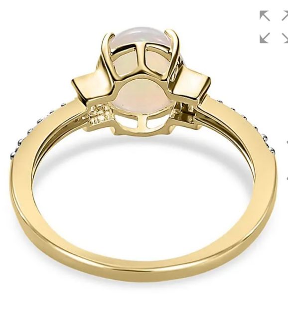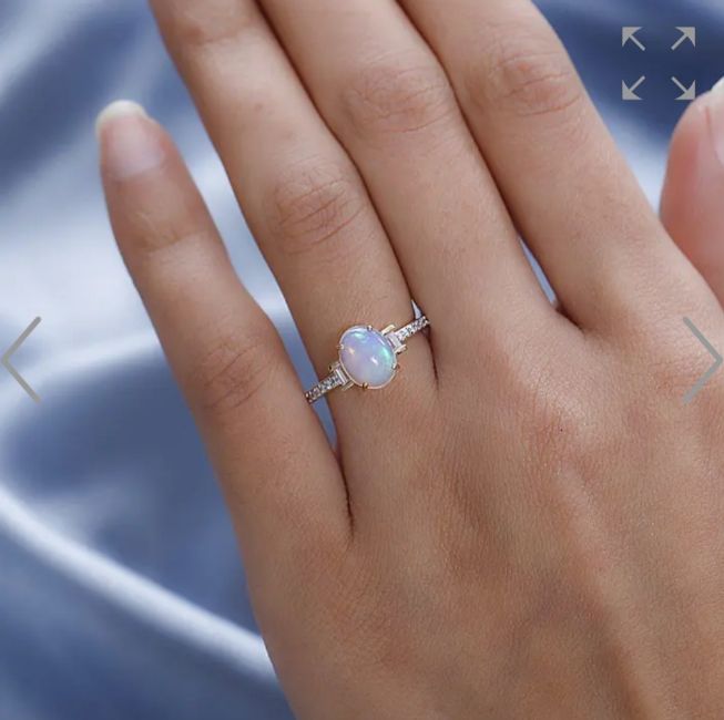 The opal is set in a classic design with moissanites adorning the shank, adding extra sparkle to the piece.
