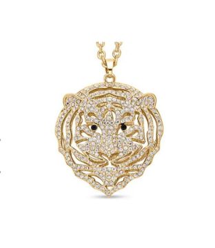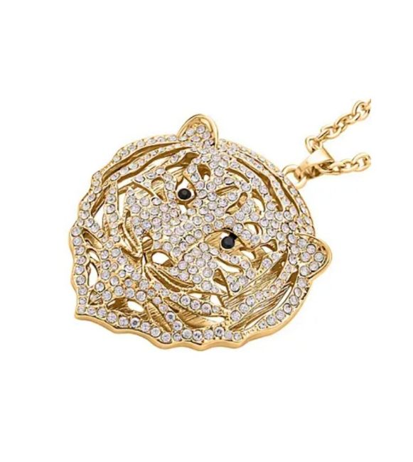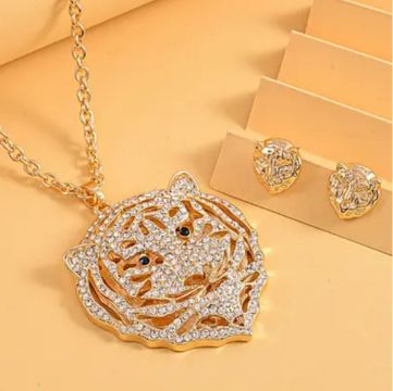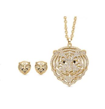 Indulge your wild side with this stunning Austrian Crystal and Black Crystal Pendant and Earrings Set in Yellow Gold Tone, designed in the shape of a tiger.