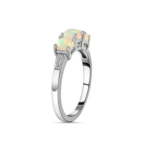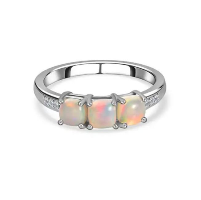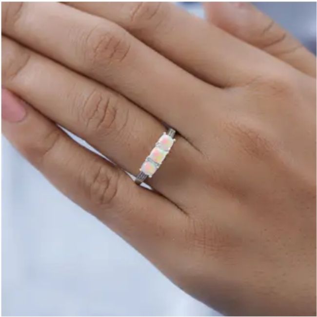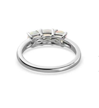 True to its nature, the Ethiopian Welo opal is considered to give a sense of calmness to its wearer. The design of this Ethiopian Welo opal trilogy ring displays the same – tranquillity. The three oval stones, together weighing 0.86 carat, are embedded in platinum overlay sterling silver. A four-prong setting beautifully reveals the calmness that the stones emit.