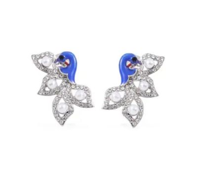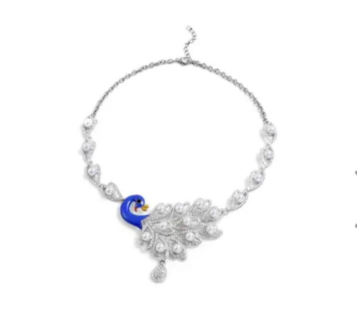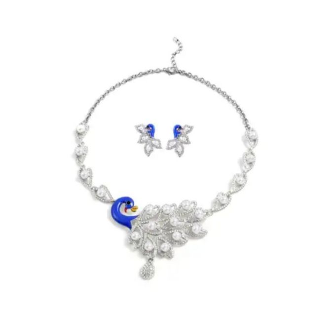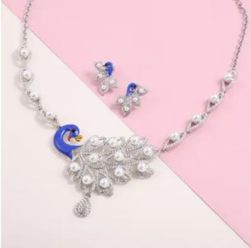 A beautiful set of necklace and earrings boasting the design of a peacock created through subtle arrangement of White and Black Austrian Crystal and Simulated Pearls.