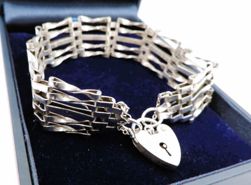 A fine quality sterling silver gate bracelet and heart padlock 1.5cm wide 7 inches long (18cm) - weight 16.7 grams.
