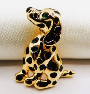 Title: Vintage Gold Plated Enamel Dalmatian Puppy Brooch