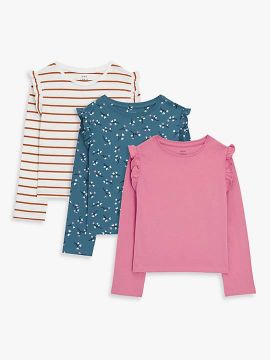 John Lewis Kids' Stripe/Floral/Plain Ruffle Sleeve Jersey Tops, Pack of 3, Multi.