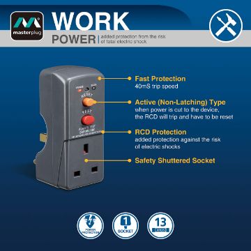 Masterplug non-latching single socket safety RCD adaptor continuously monitors the power supply to an electrical appliance and cuts off the power within 40 milliseconds if an earth current fault is detected.