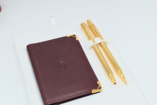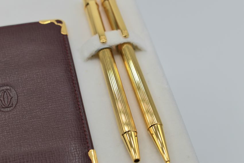 This beautiful Cartier Must II gold-plated ballpoint pen, mechanical pencil and leather wallet set is in excellent, unused condition.