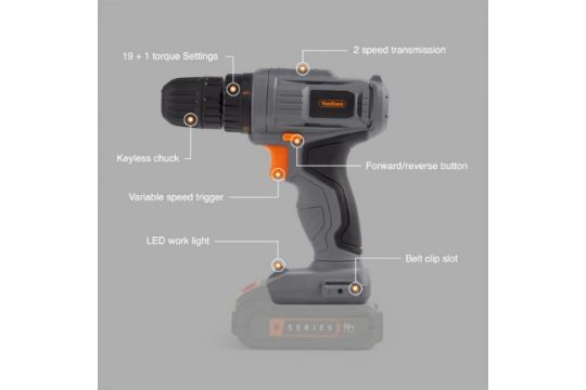 The drill features an LED work light for dim conditions, a soft grip handle for comfort and a convenient belt clip.
