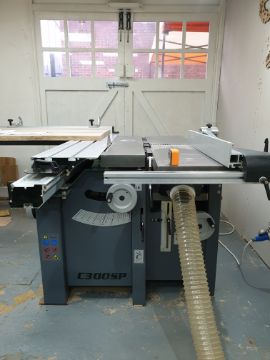 The machine consists of a table saw and sliding table, planer, thicknesser, and spindle moulder