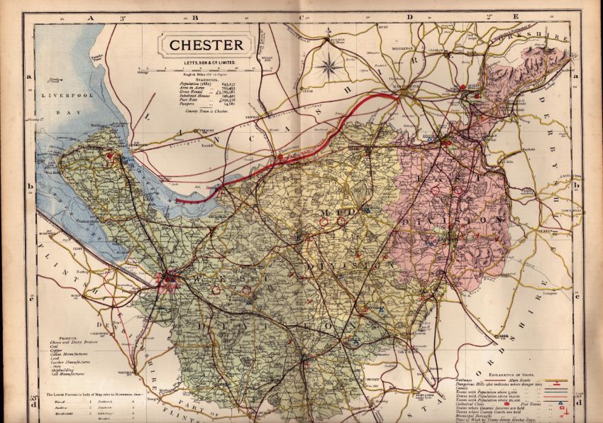 The City Of Chester Large Victorian Letts 1884 Antique Coloured Map.