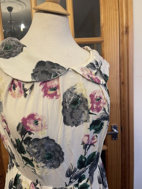 This is the classic 1950s summer dress in a light weight vintage material with grey and pink flowers and  constructed in the classic fit and flare style with the under arm zip and dress lining.