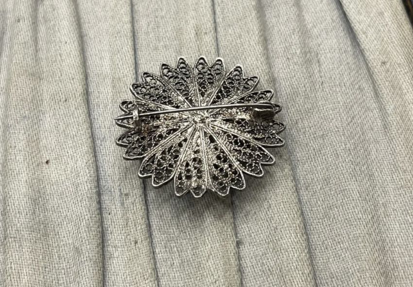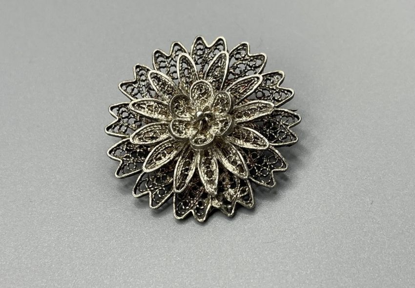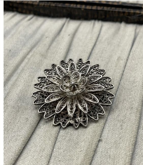 Title: Vintage Filigree Flower Brooch Unmarked Silver Pin Sweetheart Floral Intricate