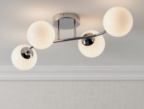 This 4 lamp ceiling light is from our Statera range, a contemporary ceiling light which has a chrome effect finish and features globe shades with frosted glass effect detailing.