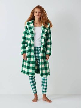 John Lewis ANYDAY Gingham Borg Dressing Gown, Green/Ivory, M.