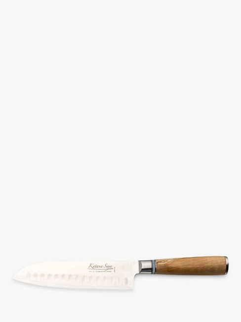 Katana Saya Damascus Steel Santoku Kitchen Knife with Olive Handle & Leather She.