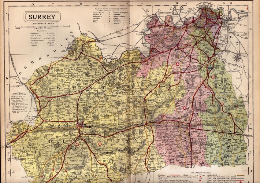 The County of Surrey Large Victorian Letts 1884 Antique Coloured Map.