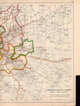 Bacons Vintage London County Courts Bus & Tram Routes Coloured Map.