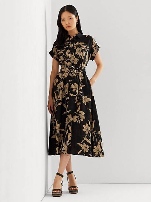 Lauren Ralph Lauren Geometric Print Crepe Flutter Sleeve Midi Dress, Black/Tan.