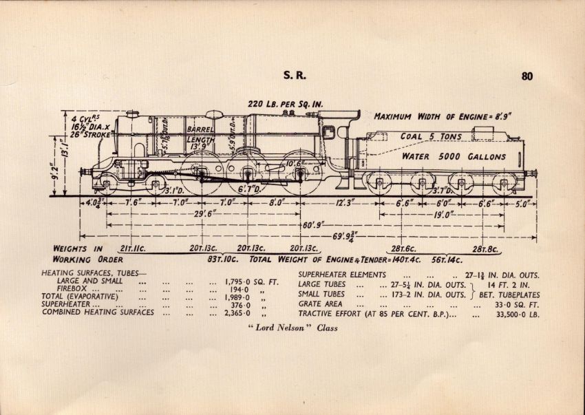 S.R. Railway Lord Nelson Detailed Drawing Diagram 85 Yrs Old Print.