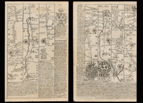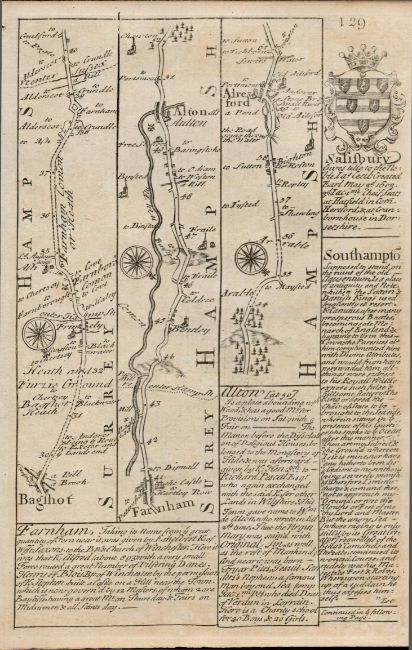 Bowen 290 Yrs Old  Detailed Road Map Bagshot, Farnham, Southampton, Salisbury.