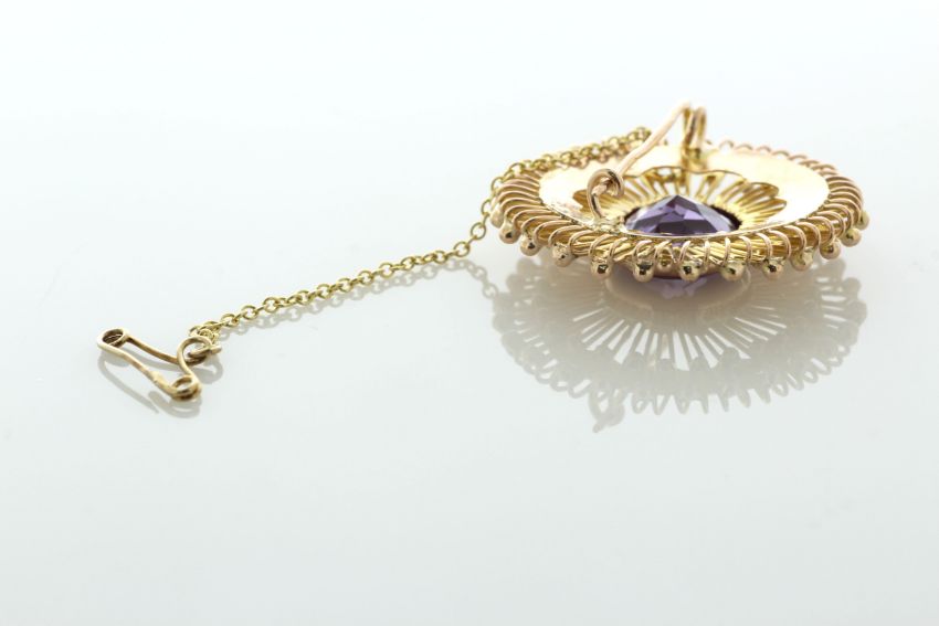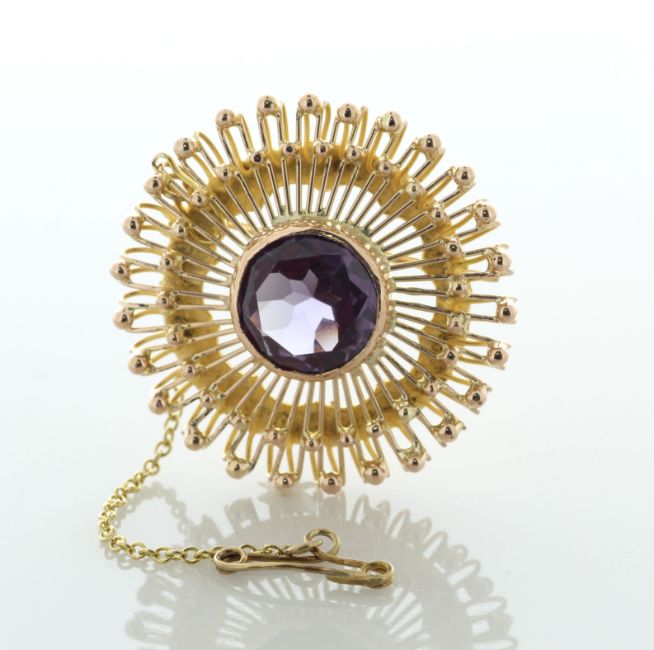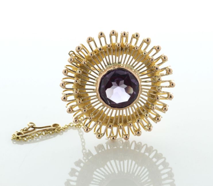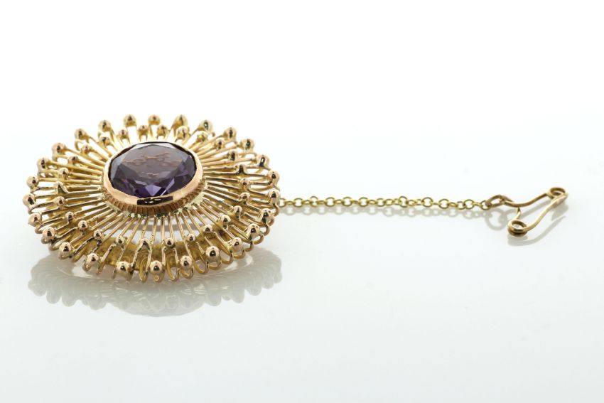 This brooch has a 14ct yellow gold safety catch chain.