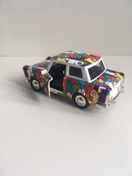Authorised collectors pieces by Thierry Noir & Muddastadt Gmbh Berlin, The Trabant is a 1:39 Scale Model of the original full scale Trabant Car with Pull back and go friction mechanism and decorated by Thierry Noir from his 1984 art invasion of berlin.